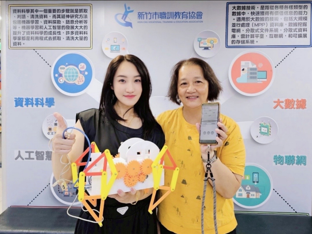 ▲報名參加勞動部桃竹苗分署委託新竹市職訓教育協會辦理「機械製圖及智慧自動化設計人才培訓班」的莊美絨同學(右),訓後利用工作之餘持續回新竹職訓優化結訓專題作品,強化機構及程式的設計,精神值得敬佩。新竹市職訓教育協會執行長鄔佩儒(左)與莊美絨同學暨作品一同合影。(圖/新竹市職訓教育協會提供)