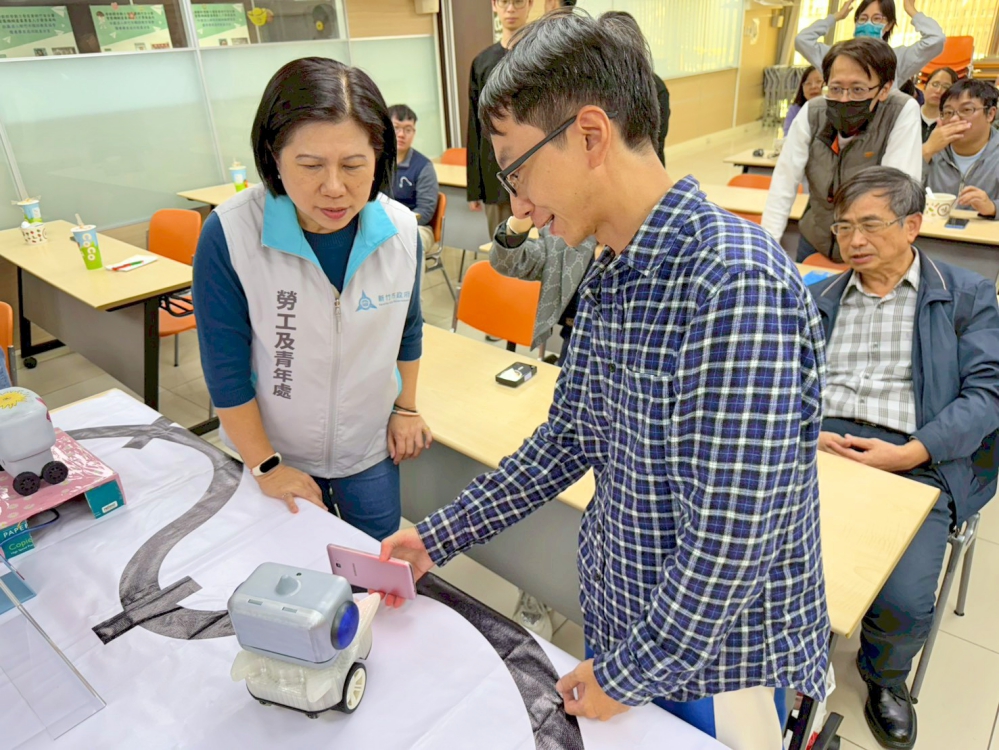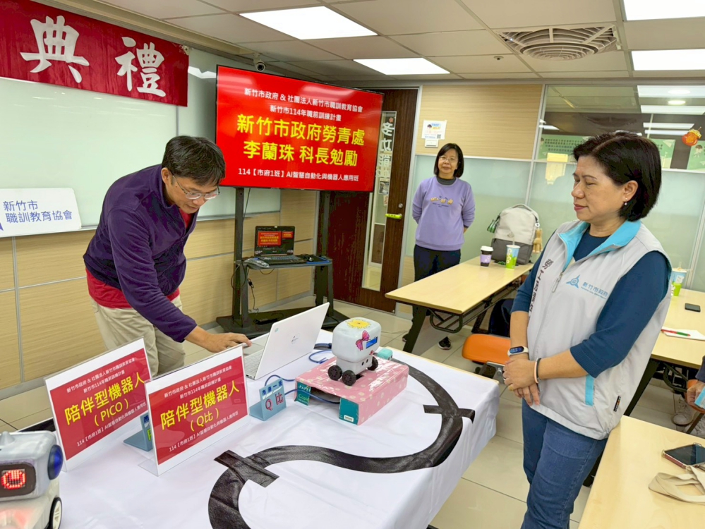 ▲新竹市政府補助114年「AI智慧自動化與機器人應用班第01期(302H)」結訓典禮,學員於現場向新竹市政府勞青處李蘭珠科長(左)展示操作『陪伴型機器人~ PICO』成果。