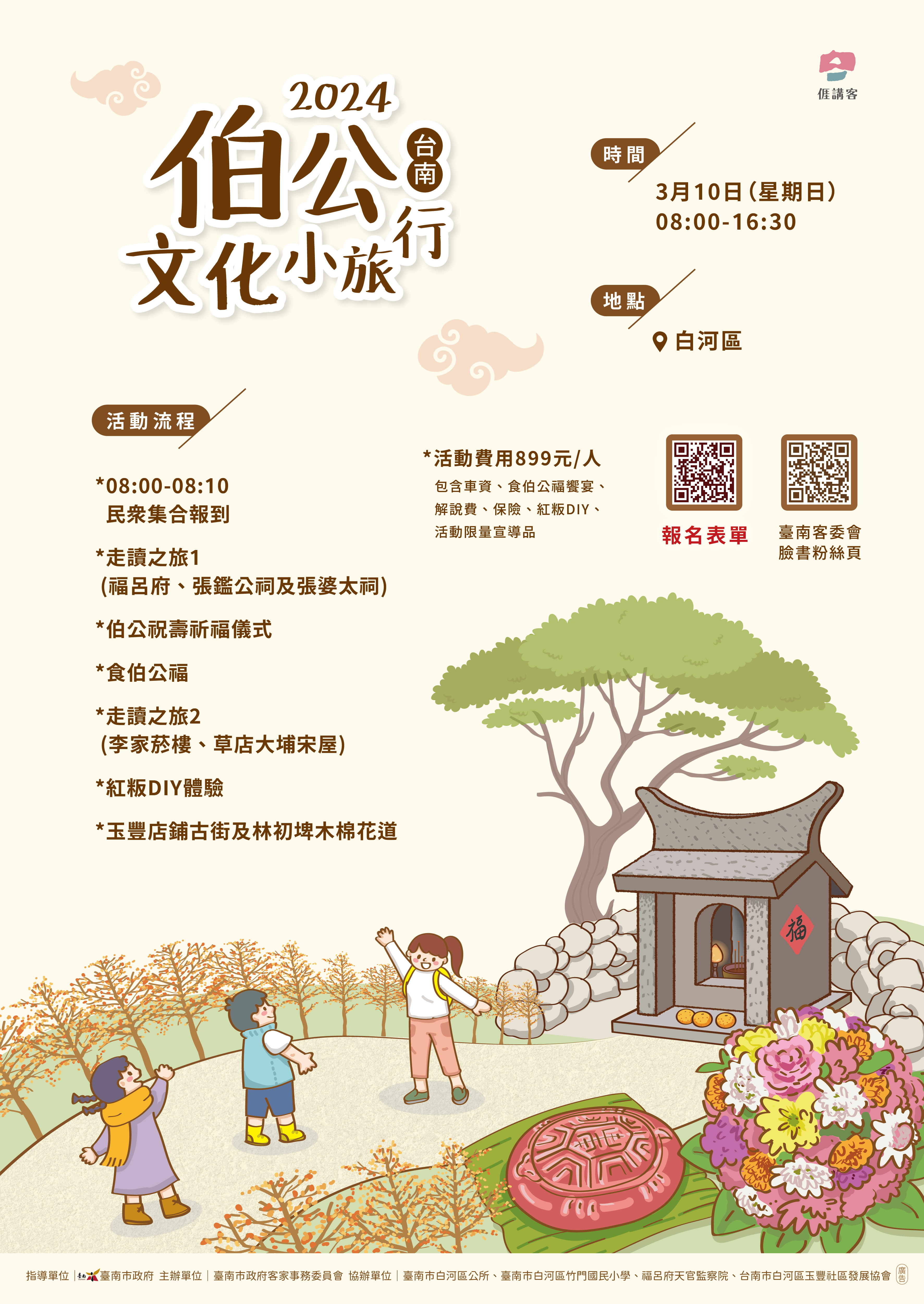 臺南客委會表示,臺南是客家先民在大航海時代渡過黑水溝登陸後踏入臺灣土地的門戶之一,在白河、楠西、東山都有早期客家移居的歷史痕跡。如今白河崎內里還有多戶人家可以用流利的客語交談。這次小旅行不僅能在白河最早創建的土地公廟「客庄內福呂府」用客家傳統祭典儀式幫伯公慶生,走訪張鑑公祠及張婆太祠、李家菸樓及草店大埔宋屋,還能欣賞季節限定美景林初埤木棉花以及製作客家紅粄,讓民眾從伯公信仰,認識臺南客家最接地氣的文化活動。