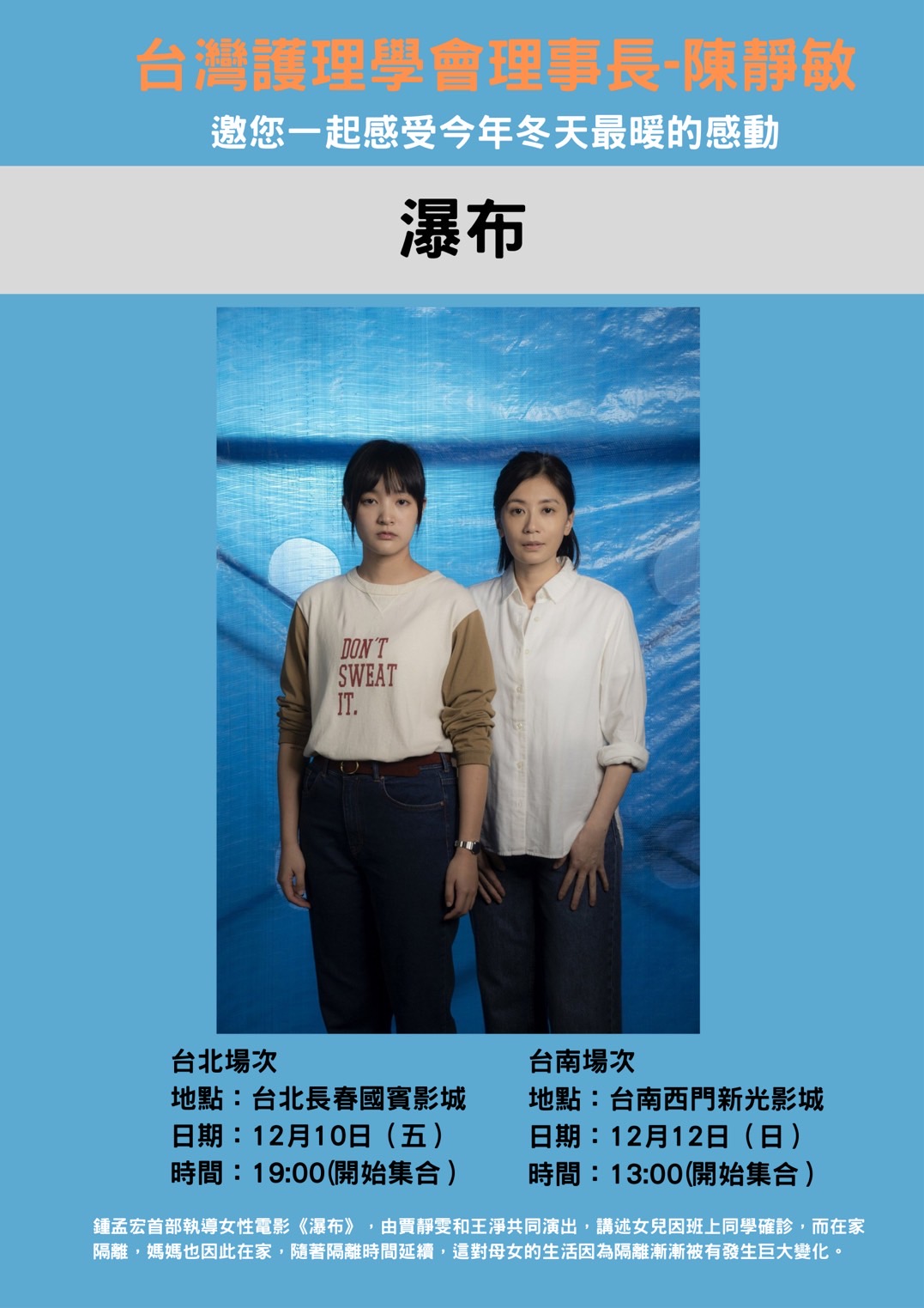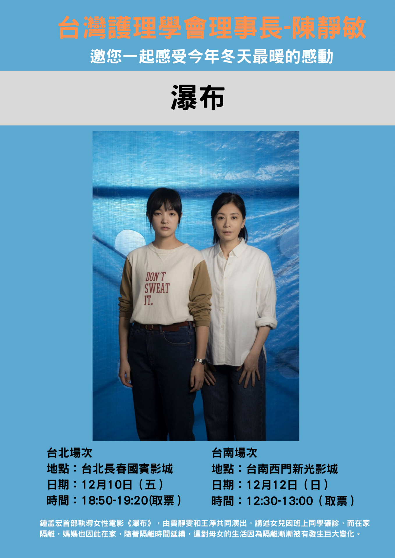 台灣護理學會理事長陳靜敏邀請您一同觀賞-金馬58最佳劇情長片(電影瀑布)電影分享會